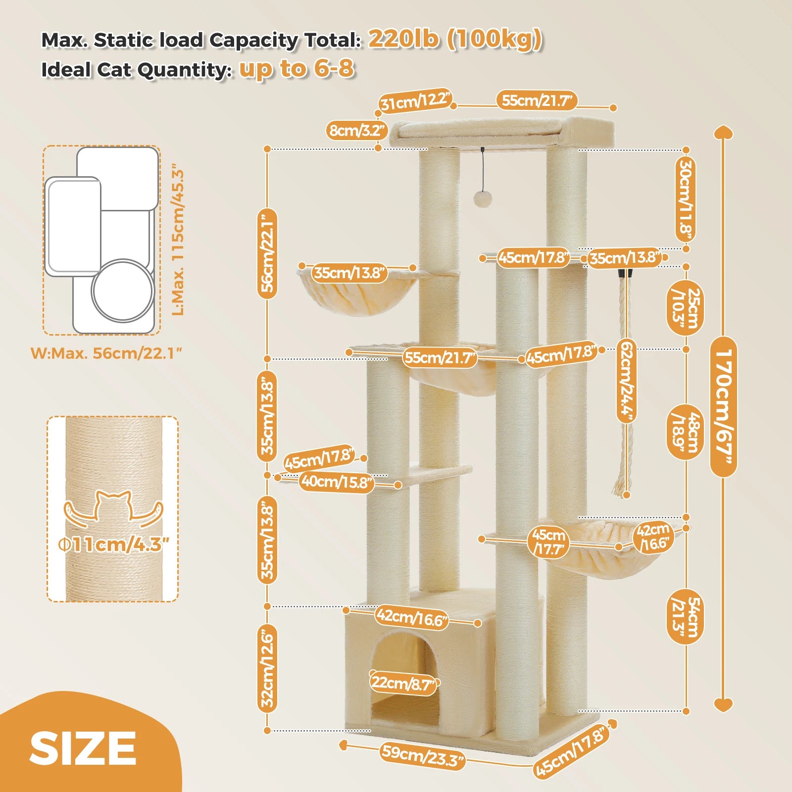 Standing at an impressive 169cm tall, this multi-level cat condo offers spacious platforms, a cozy cave, and an oversized hammock, making it perfect for large cats like Maine Coons or Ragdolls. Its wide perches and multiple resting spots ensure your cats always have a comfortable place to relax and observe their surroundings.