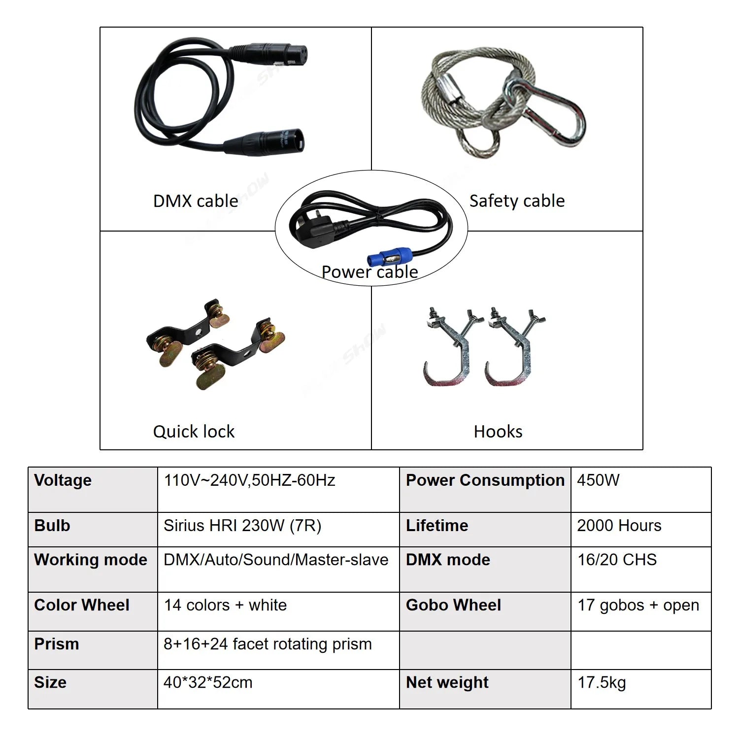 The Moving Head 7R Beam 230W is designed for longevity with a lamp life of 3000 hours and includes a complete accessory package – including a power cable, DMX cable, safety cable, light hooks, and clamp locks.